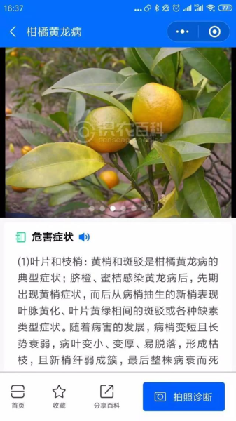 圖片為AI“識農(nóng)”小程序?qū)Ω涕龠M(jìn)行黃龍病識別的示例
