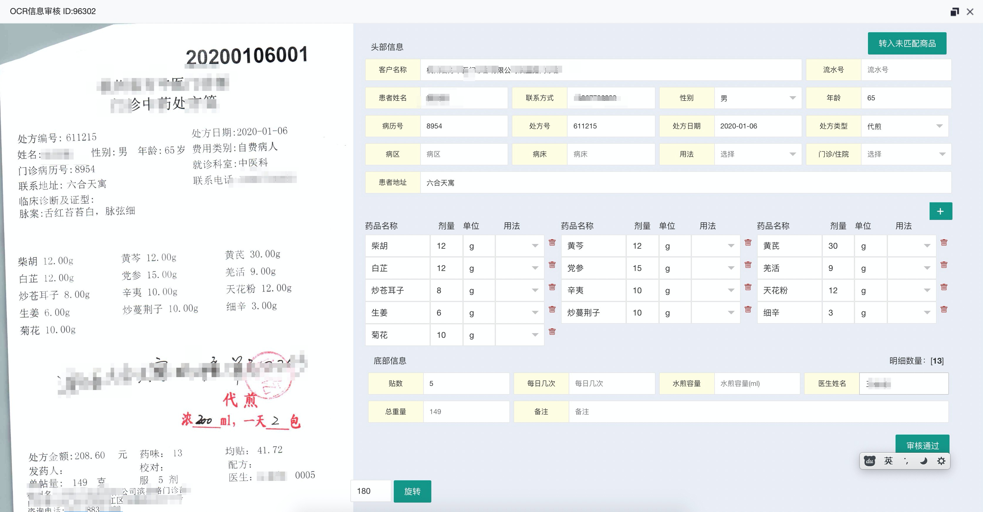 第三步、服務(wù)器系統(tǒng)將返回的處方文字信息轉(zhuǎn)換為標(biāo)準(zhǔn)的電子處方單后,先通過人工審核確認(rèn)電子處方單信息無誤后,系統(tǒng)會將處方信息自動保存到處方數(shù)據(jù)庫中。